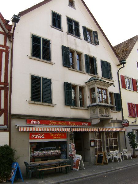 1670 datierter Sandsteinerker mit Reliefwappen Hans Melchior Füllemann --Barbara Hausmann